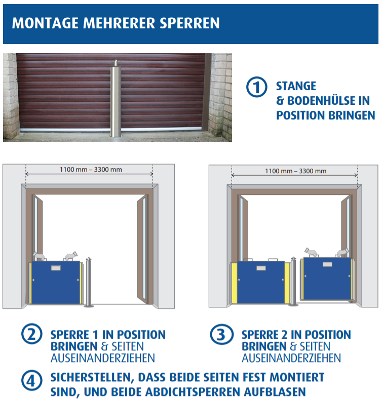 Die Sperre schützt Ihr Haus vor Hochwasser mit 600 mm Stauhöhe. Dabei funktioniert die Hochwasserbarriere ohne Schrauben, Schienen, Bohren oder ähnlichen Maßnahmen.