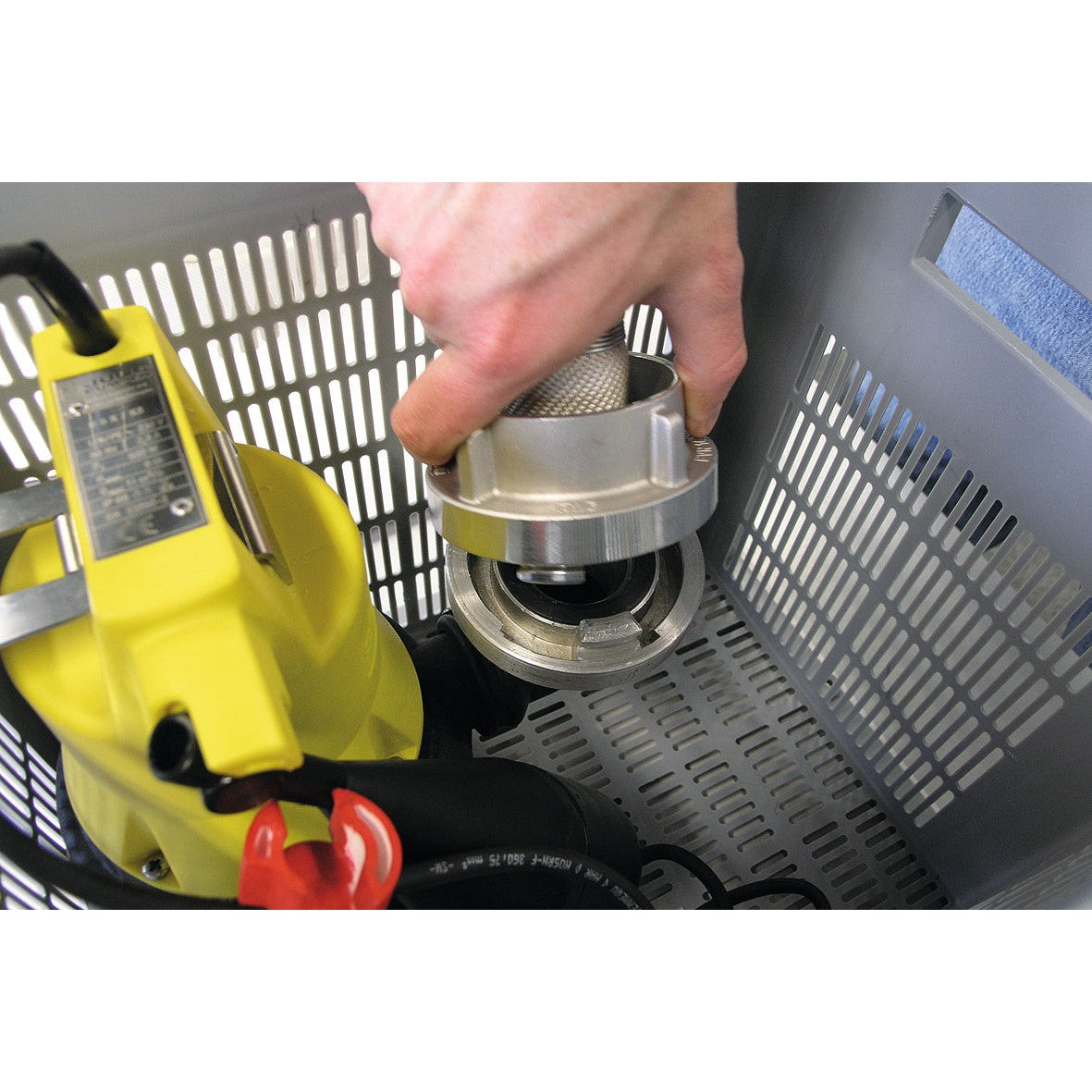 In einer robusten und kompakten Kunststoffbox arbeitet eine leistungsstarke U5 KS Tauchpumpe. Dabei hat die Schmutzwasserpumpe dank Fixierung im Korb immer einen sicheren Stand. Ausgerüstet mit einem 10 m Stromkabel und einem 12,5 m langen Feuerwehr C-Schlauch (samt Storz-Kupplung) ist das System blitzschnell, kinderleicht und flexibel zu installieren.